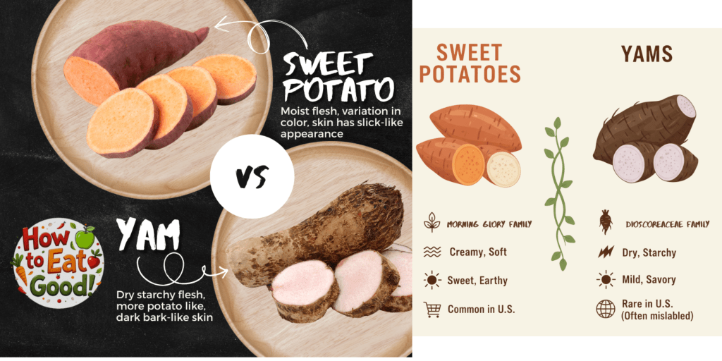 In the United States, firm varieties of sweet potatoes were grown first. When softer varieties were later produced commercially, there was a need to tell them apart. Our Enslaved African ancestors had already been calling the softer variety yams because they resembled the yams from their home continent. That name stuck, even though true yams are a totally different crop.