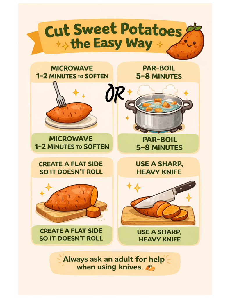 - To make raw sweet potatoes easier to cut, poke a few holes with a fork and microwave for 1–2 minutes before chopping.