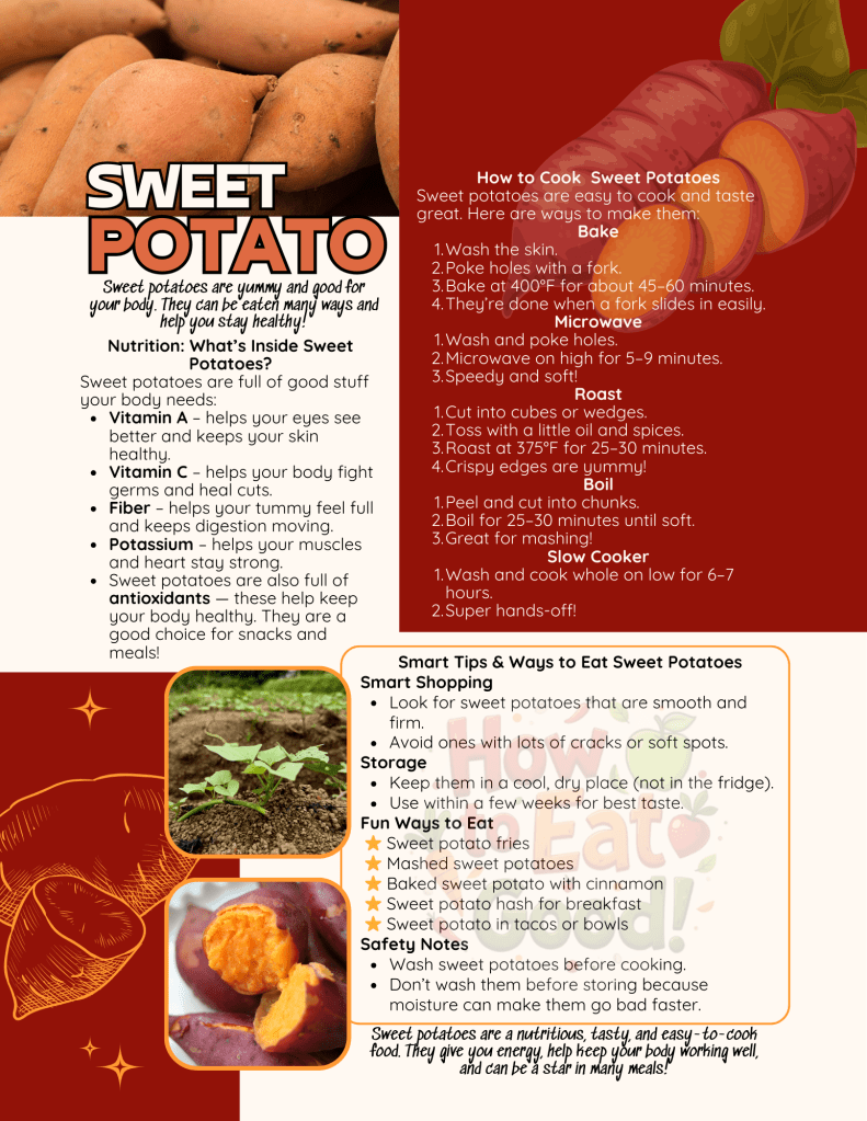 - United States Department of Agriculture (USDA). MyPlate: Sweet Potatoes Nutrition Information. https://www.myplate.gov